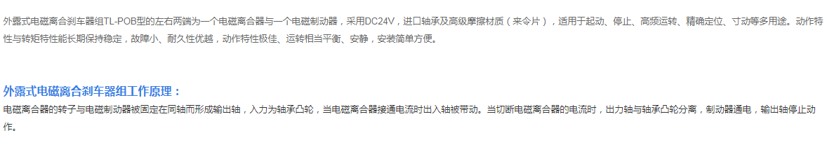 外露式電磁離合剎車器組TL-POB型的左右兩端為一個(gè)電磁離合器與一個(gè)電磁制動(dòng)器,采用DC24V,進(jìn)口軸承及高級(jí)摩擦材質(zhì)(來令片),適用于起動(dòng)、停止、高頻運(yùn)轉(zhuǎn)、精確定位、寸動(dòng)等多用途。動(dòng)作特性與轉(zhuǎn)矩特性能長期保持穩(wěn)定,故障小、耐久性優(yōu)越,動(dòng)作特性極佳、運(yùn)轉(zhuǎn)相當(dāng)平衡、安靜,安裝簡單方便。