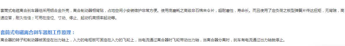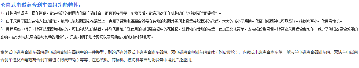 套筒式電磁離合剎車器組采用鋁合金外殼,離合制動器相背貼,占地空間小安裝維護(hù)非常方便。使用底磨耗之高級非石棉來令片,超耐磨性,壽命長。而且使用了定負(fù)荷之板型彈簧片傳達(dá)扭矩,無背隙,高速應(yīng)答,耐久性佳;可用在定位、寸動、停止、起動機(jī)高頻率起動等。