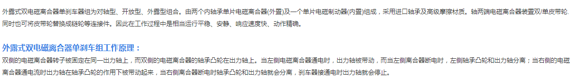 外露式雙電磁離合器單剎車器組為對軸型、開放型、外露型組合。由兩個內(nèi)軸承單片電磁離合器(外置)及一個單片電磁制動器(內(nèi)置)組成,采用進口軸承及高級摩擦材質(zhì)。軸兩端電磁離合器裝置雙/單皮帶輪.同時也可將皮帶輪替換成鏈輪等連接件。因此在工作過程中是相當運行平穩(wěn)、安靜、響應(yīng)速度快、動作精確。