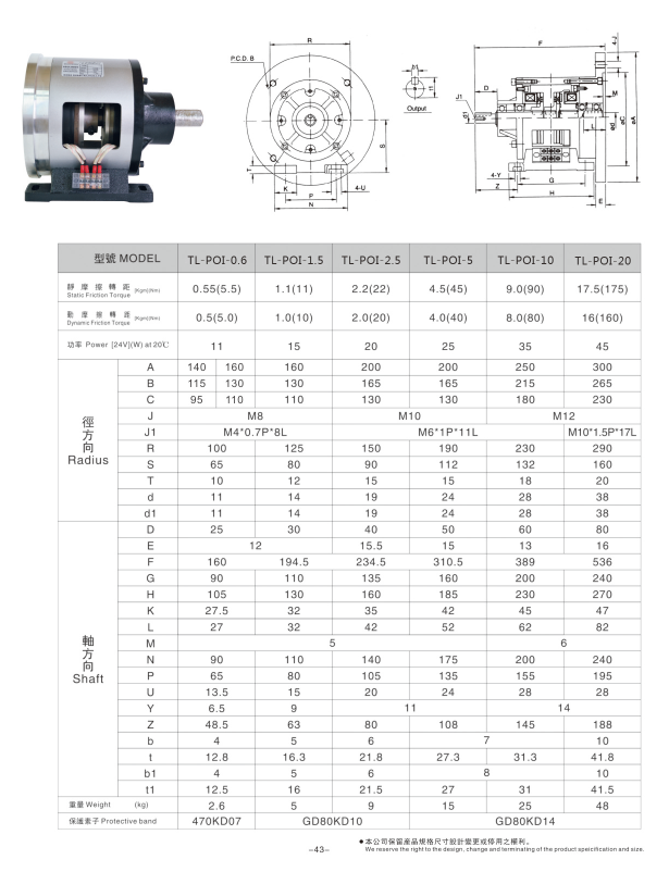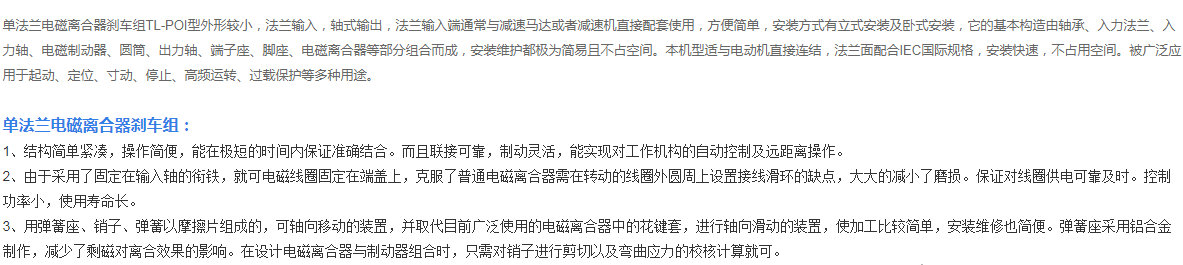 單法蘭電磁離合器剎車組TL-POI型外形較小,法蘭輸入,軸式輸出,法蘭輸入端通常與減速馬達或者減速機直接配套使用,方便簡單,安裝方式有立式安裝及臥式安裝,它的基本構(gòu)造由軸承、入力法蘭、入力軸、電磁制動器、圓筒、出力軸、端子座、腳座、電磁離合器等部分組合而成,安裝維護都極為簡易且不占空間。