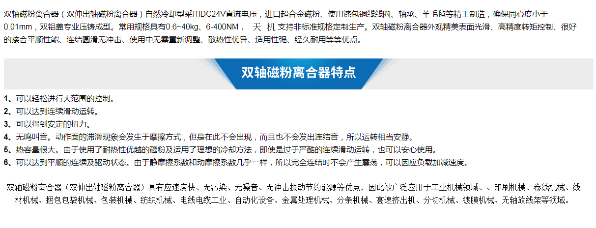 雙軸磁粉離合器(雙伸出軸磁粉離合器)自然冷卻型采用DC24V直流電壓,進口超合金磁粉、使用漆包銅線線圈、軸承、羊毛氈等精工制造,確保同心度小于0.01mm,雙鋁蓋專業(yè)壓鑄成型。常用規(guī)格具有0.6~40kg、6-400NM,天機支持非標準規(guī)格定制生產(chǎn)。雙軸磁粉離合器外觀精美表面光滑、高精度轉(zhuǎn)矩控制、很好的接合平順性能、連結圓滑無沖擊、使用中無需重新調(diào)整、散熱性優(yōu)異、適用性強、經(jīng)久耐用等等優(yōu)點。
