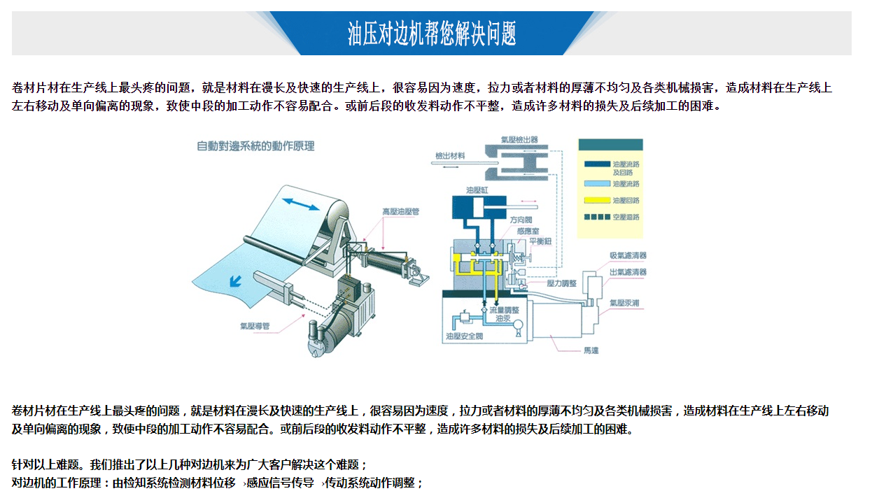 油壓式對(duì)邊機(jī):可分為自動(dòng)、手動(dòng)、中心回位及全自動(dòng)型。金牌對(duì)邊機(jī)為真正無(wú)接觸,無(wú)接點(diǎn)之動(dòng)力系統(tǒng),采用空油壓聯(lián)線系統(tǒng)制御,以空壓對(duì)流感應(yīng)方式檢查材料邊緣在檢出口所造成的差壓比例,把訊號(hào)傳達(dá)至感應(yīng)室內(nèi)部,由感應(yīng)室接收氣源系統(tǒng)判斷差壓比例之正負(fù)值,決定左右出油口的出油速度及數(shù)量。